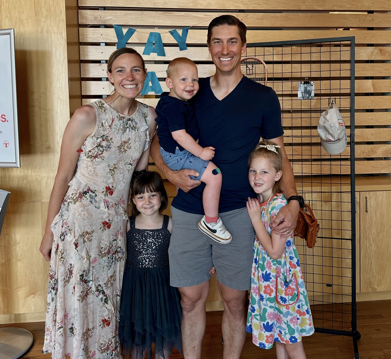 Family photo of Michael, his wife, and their three daughters and son standing indoors. All smiling.