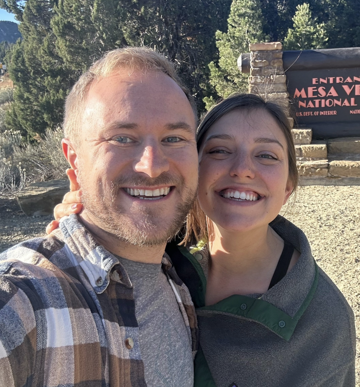 Associate pastor Will and his wife taking a selfie outdoors at Mesa Verde National Park with trees and park signs in the background.